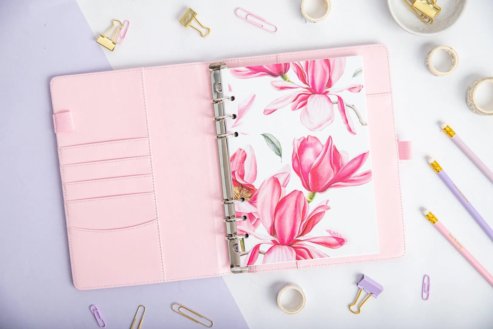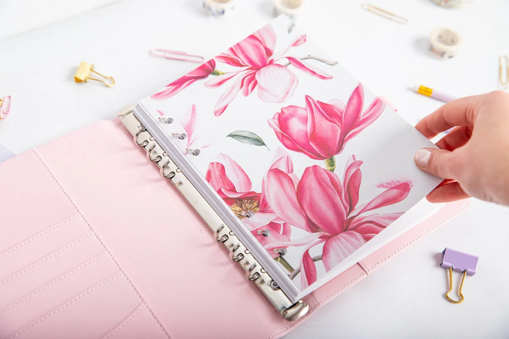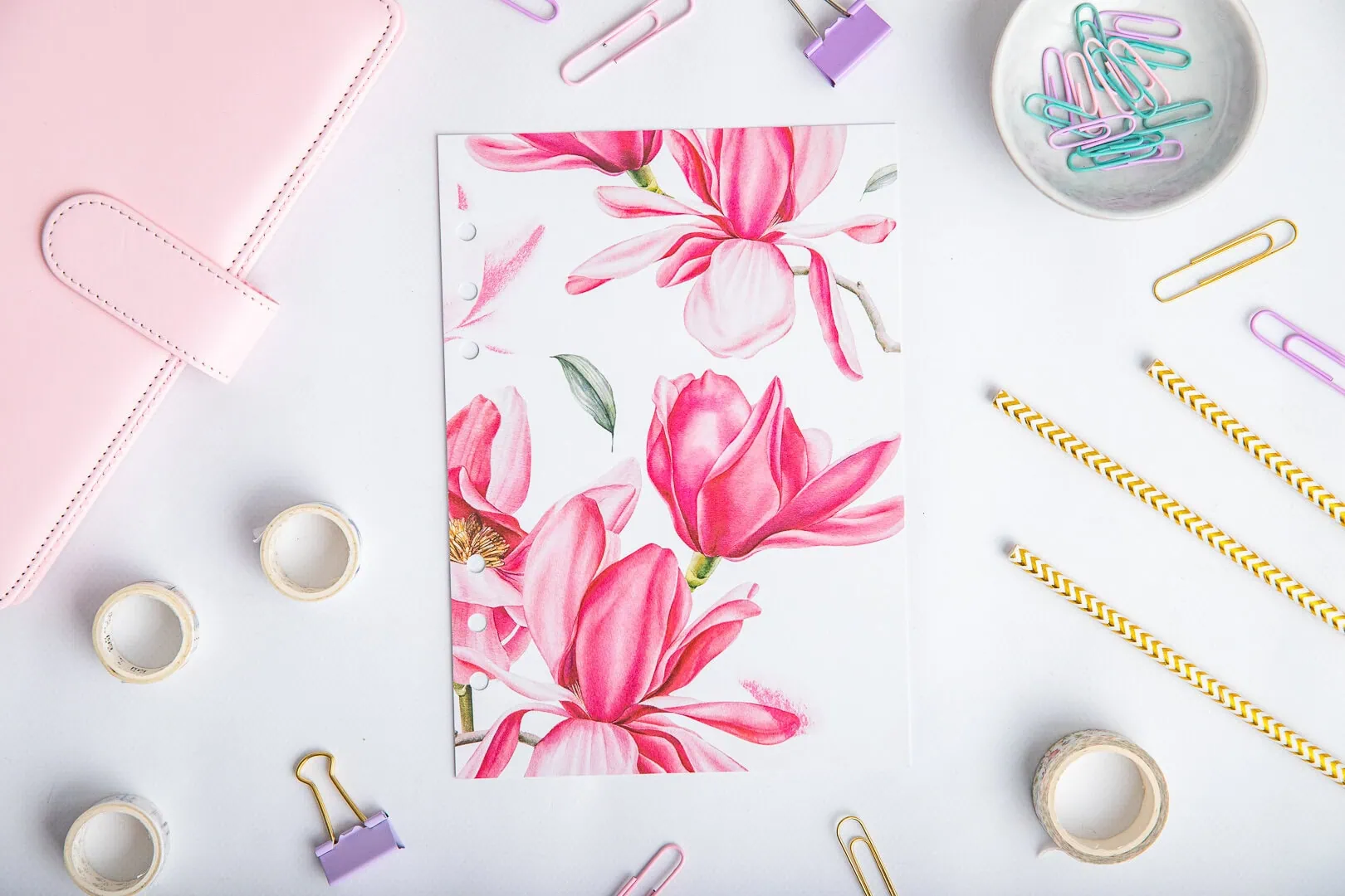 Strona tytułowa do organizera – Kwiat magnolii to doskonały sposób na rozdzielenie sekcji w Twoim organizerze, dzięki czemu łatwiej znajdziesz konkretne strony. Subtelny motyw magnolii wprowadza odrobinę koloru, sprawiając, że organizowanie staje się przyjemniejsze.
