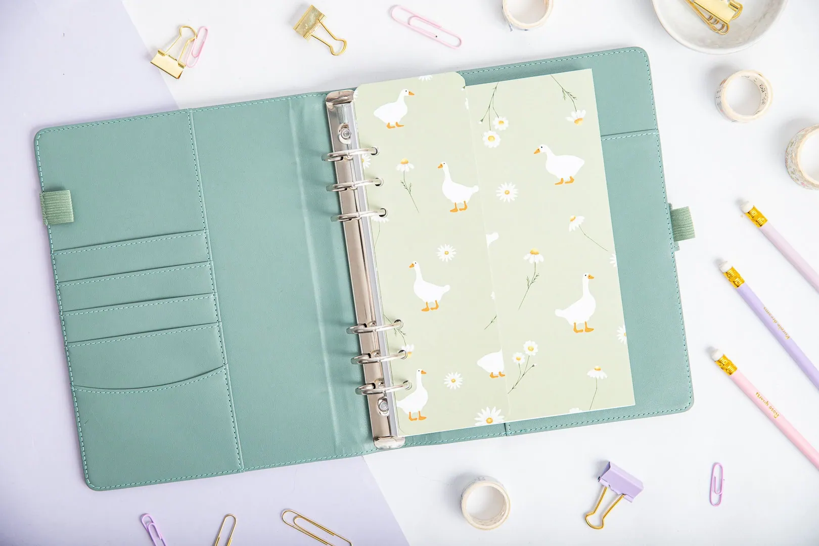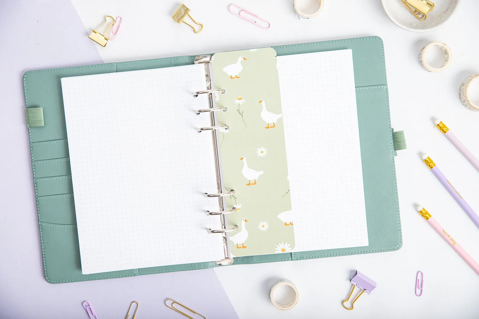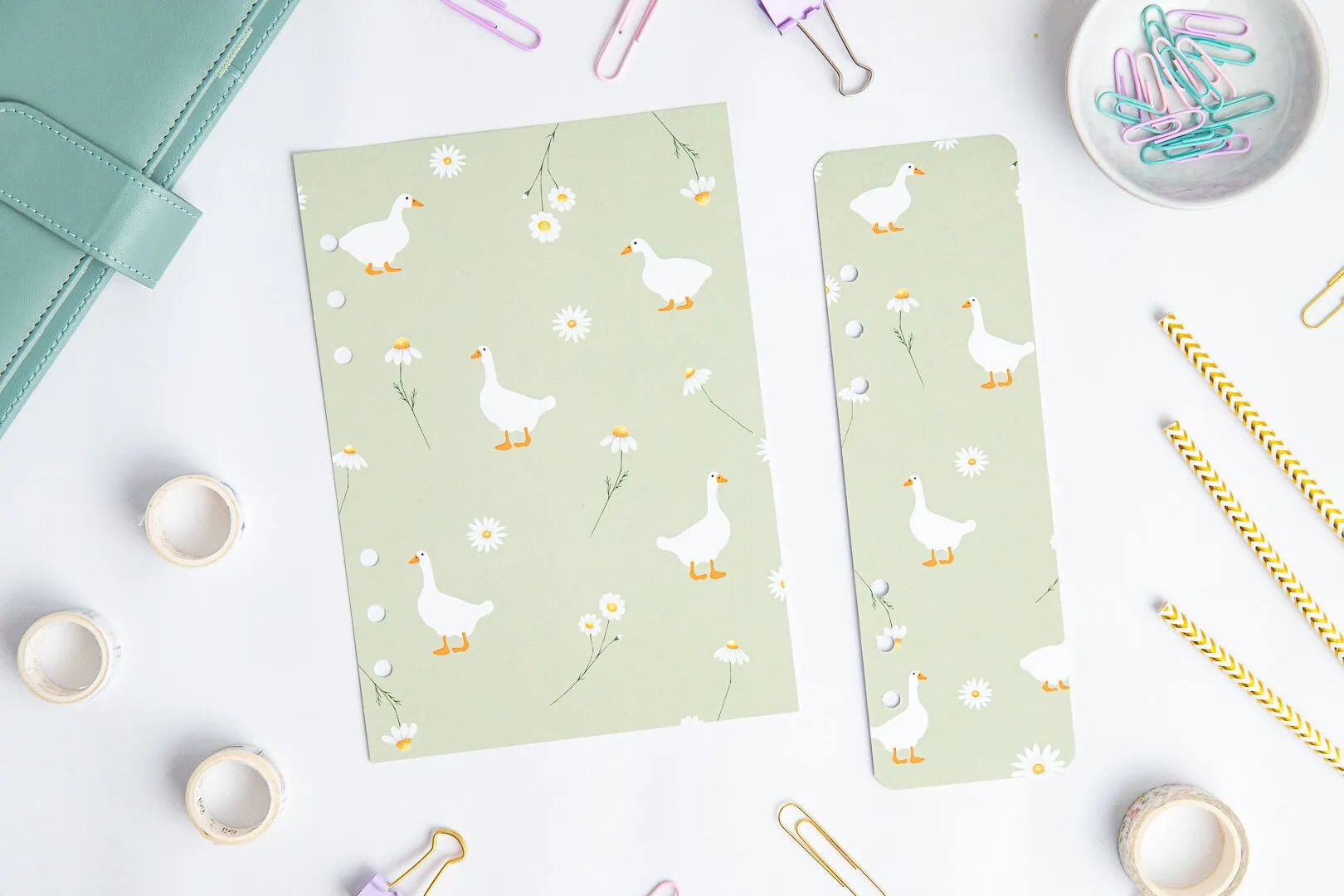 Zestaw do organizera ze stroną tytułową i zakładką – Gąski pomaga uporządkować kolejne miesiące, projekty lub ważne sekcje, żeby każda z nich miała swoje miejsce. Strona tytułowa wyraźnie oddziela etapy, dzięki czemu w środku robi się przejrzyściej i spokojniej. Zakładka pilnuje bieżącej strony – otwierasz organizer i od razu trafiasz tam, gdzie skończyłaś. Bez wertowania, bez zastanawiania się, gdzie to było.