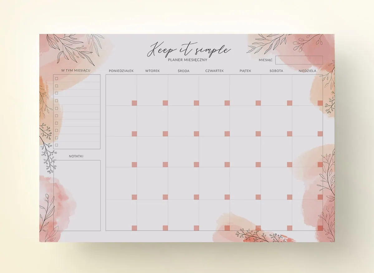 Jeśli lubisz mieć podgląd na cały miesiąc z lotu ptaka, to nasz planer miesięczny suchościeralny „Akwarela” jest właśnie dla Ciebie! Duży format planera A3 pozwoli Ci z łatwością umieścić na nim wszystkie niezbędne zapiski. Dodatkowo znajdziesz na nim również miejsce na listę to-do oraz własne notatki.