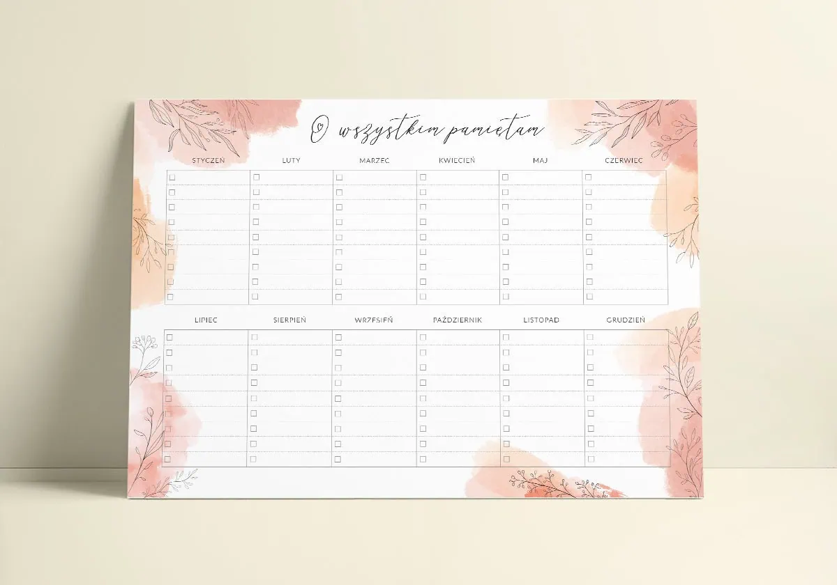 Czy często zdarza Ci się, że jakieś zadanie wypadnie Ci z głowy? Roczny planer suchościeralny „O wszystkim pamiętam” w formacie A4 pozwoli Ci zanotować wszystkie zadania, które masz do wykonania w poszczególnych miesiącach roku. 12 użytecznych checklist, opisanych nazwami kolejnych miesięcy, sprawi, że od teraz będziesz pamiętać o wszystkim, co masz do zrobienia Jeżeli chcesz, możesz go również użyć jako kalendarza urodzin.