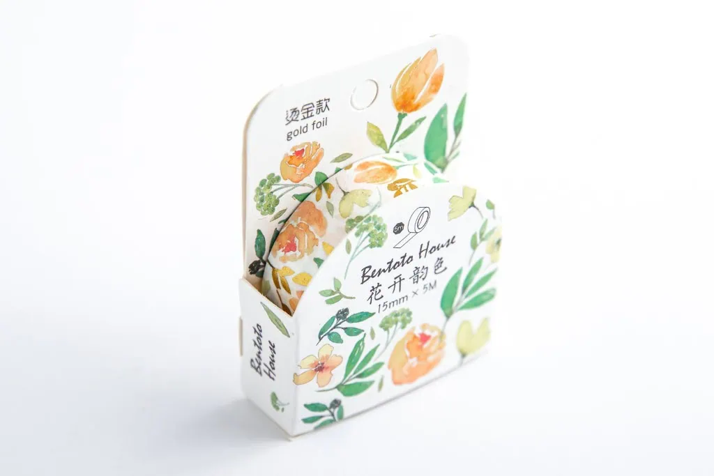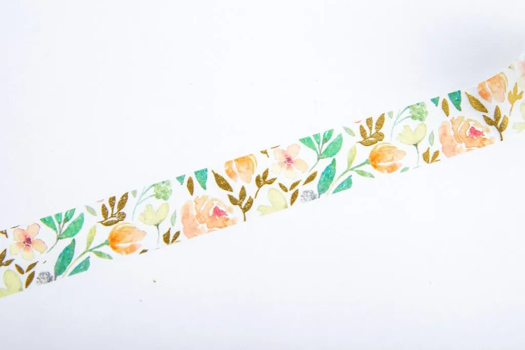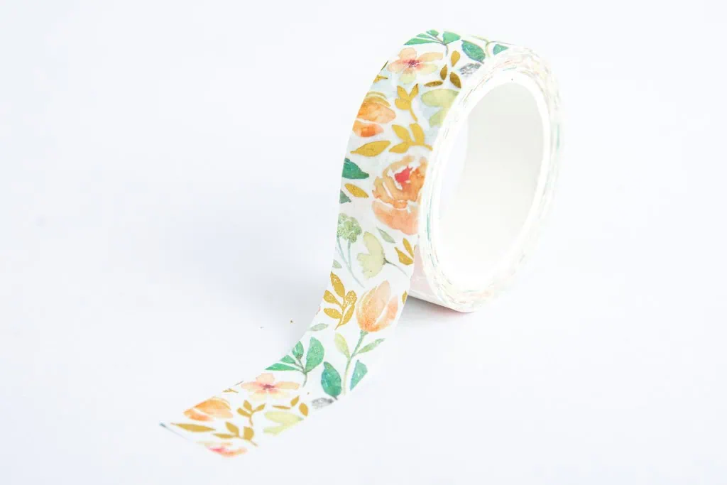 Piękna taśma dekoracyjna w kwiatowy wzór idealnie w Twoim planerze, kalendarzu czy bullet journalu. Washi tape ma uroczy wzór pomarańczowych kwiatów, które bardzo efektownie się mienią za sprawą złoceń. Złote elementy dodają elegancji i będą świetną ozdobą notatek.