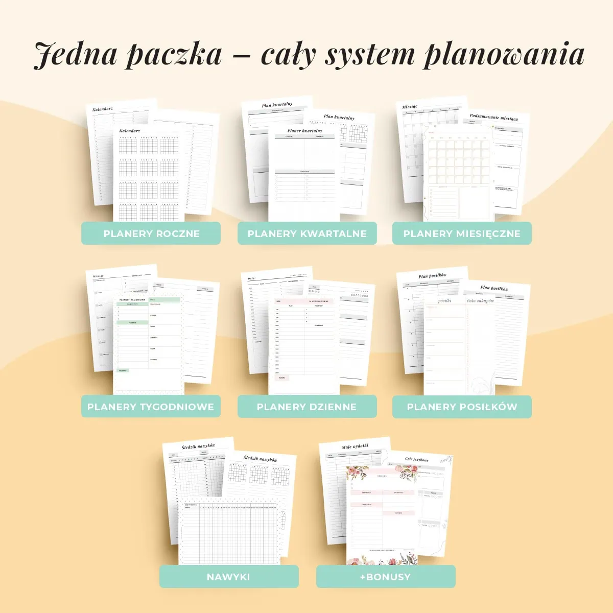 A to nie wszystko! W zestawie znajdziesz także szablony do planowania finansów, zadań, zakupów i motywacji – i wiele więcej! Różne układy, które możesz testować, łączyć i zmieniać w zależności od swoich potrzeb. Zestaw zawiera wszystkie szablony z naszych mniejszych pakietów, a także dodatkowe: dla nauczyciela i ucznia, studenta oraz do nauki języka. Pełną listę szablonów znajdziesz TUTAJ