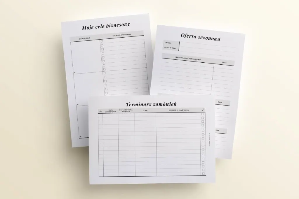 Zajmujesz się cukiernictwem? Sprawdź nasz wkład do organizera dla Cukiernika, w którym znajdziesz szablony przygotowane z myślą o prowadzeniu własnego biznesu. W środku wkładu Ogarniam Biznes — Cukiernik znajdziesz: