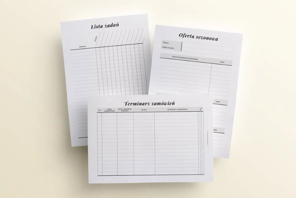 Prowadzisz kwiaciarnię? A może zajmujesz się tworzeniem bukietów? Sprawdź nasz wkład do organizera dla Florystki, w którym znajdziesz szablony przygotowane z myślą o prowadzeniu własnego biznesu. W środku wkładu Ogarniam Biznes — Florystka znajdziesz:
