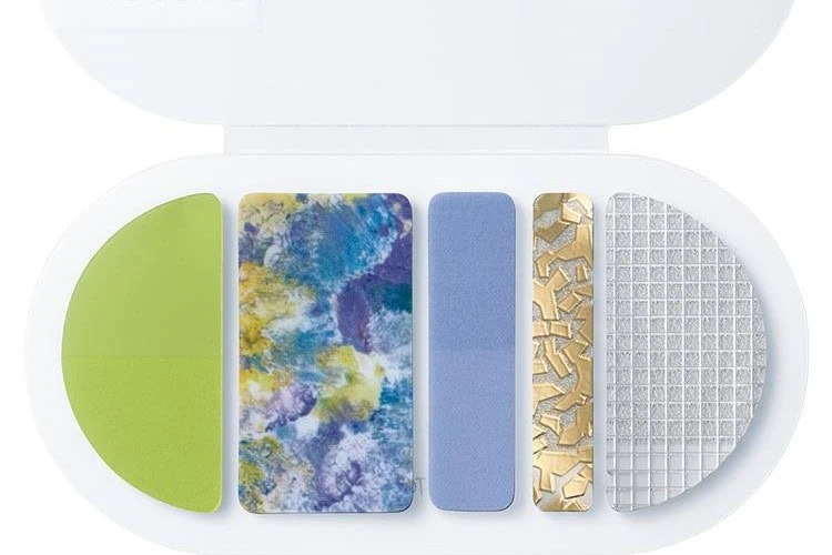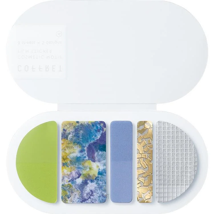 Zestaw składa się z 5 wzorów naklejek. Każdy wzór ma po 8 sztuk. Naklejki utrzymane są w chłodnej kolorystyce – zielenie, odcienie niebieskiego czy srebrny i złoty. Zapakowane są w wygodne pudełeczko, z którego bezpośrednio odrywa się naklejki.
