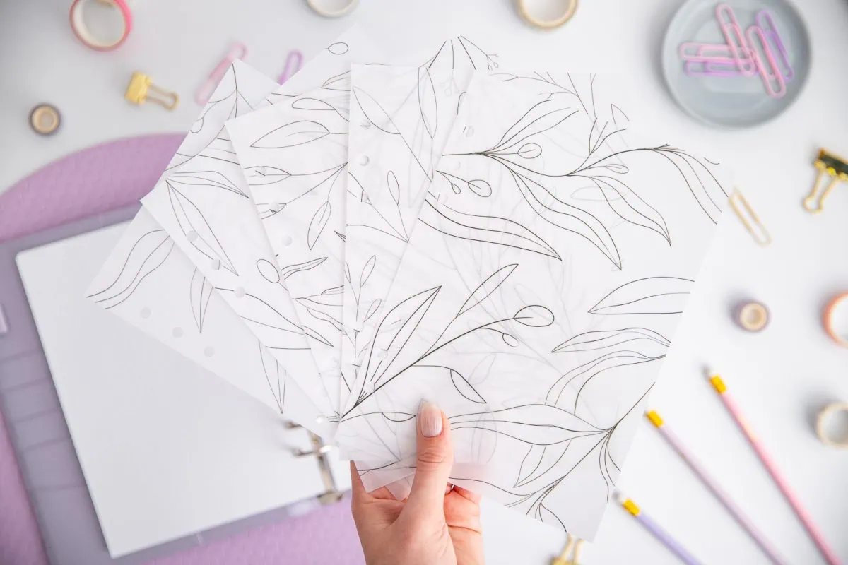 Kalka jest bezbarwna, cienka i lekka – więc nie pogrubia organizera, nawet jeśli dodasz kilka kart naraz. Jednocześnie jest wystarczająco sztywna, żeby dobrze się trzymała i nie gniotła. Każda karta ma inny wzór, ale wszystkie utrzymane są w tym samym spokojnym klimacie – pasują do pastelowych stron i subtelnych dodatków.