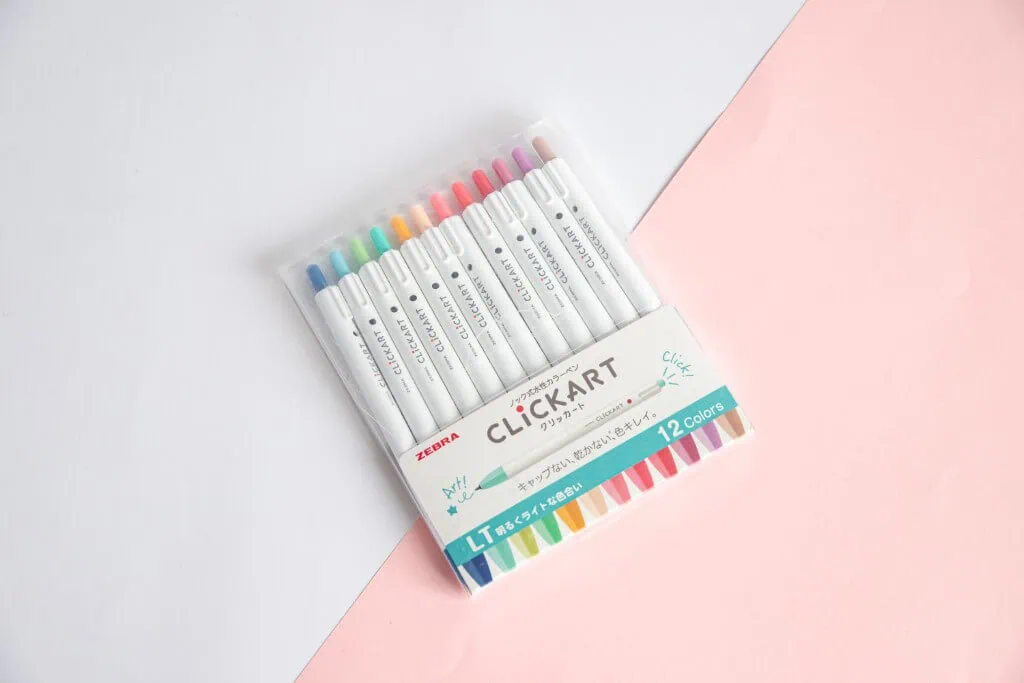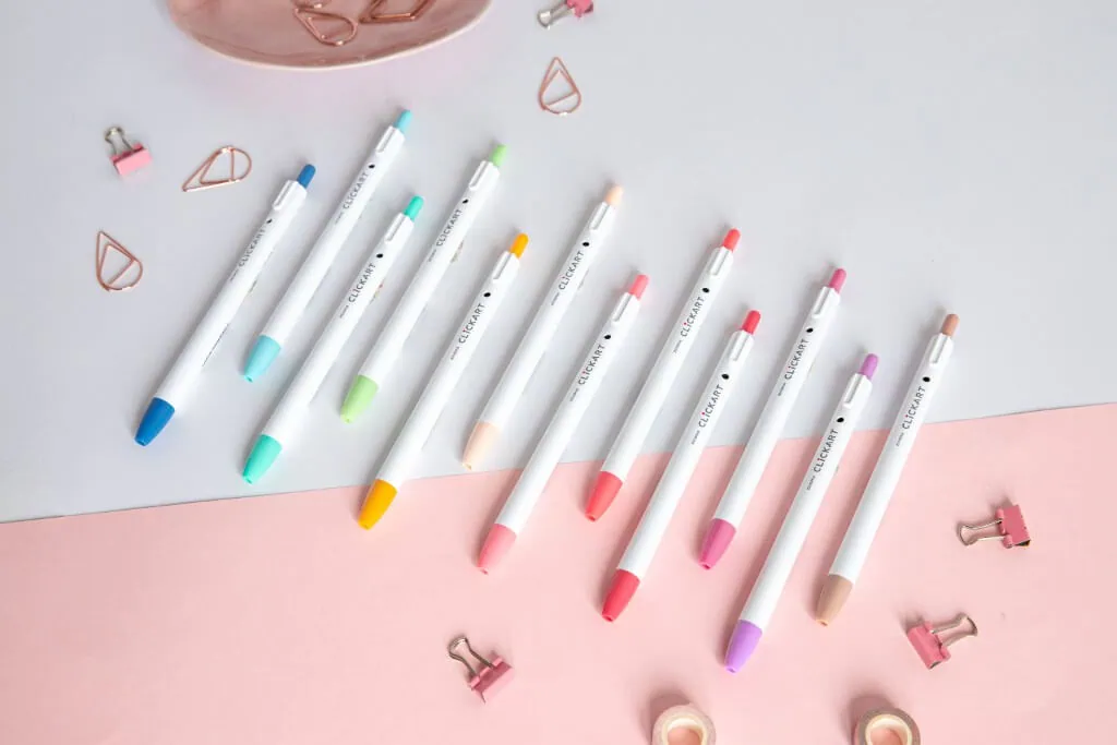 Dzięki specjalnej konstrukcji i nowej technologii atramentu pisaki Zebra ClickArt pochłaniają wilgoć z powietrza co zapobiega ich wysychaniu. Zestaw zawiera mazaki w 12 pastelowych kolorów, idealnych do pisania, rysowania oraz tworzenia bullet journal. Prosty i minimalistyczny design sprawia, że korzystanie z nich jest wygodniejsze niż kiedykolwiek. Pisaki nie mają nasadek. Wystarczy więc jedno kliknięcie i już możesz cieszyć się przyjemnością tworzenia!