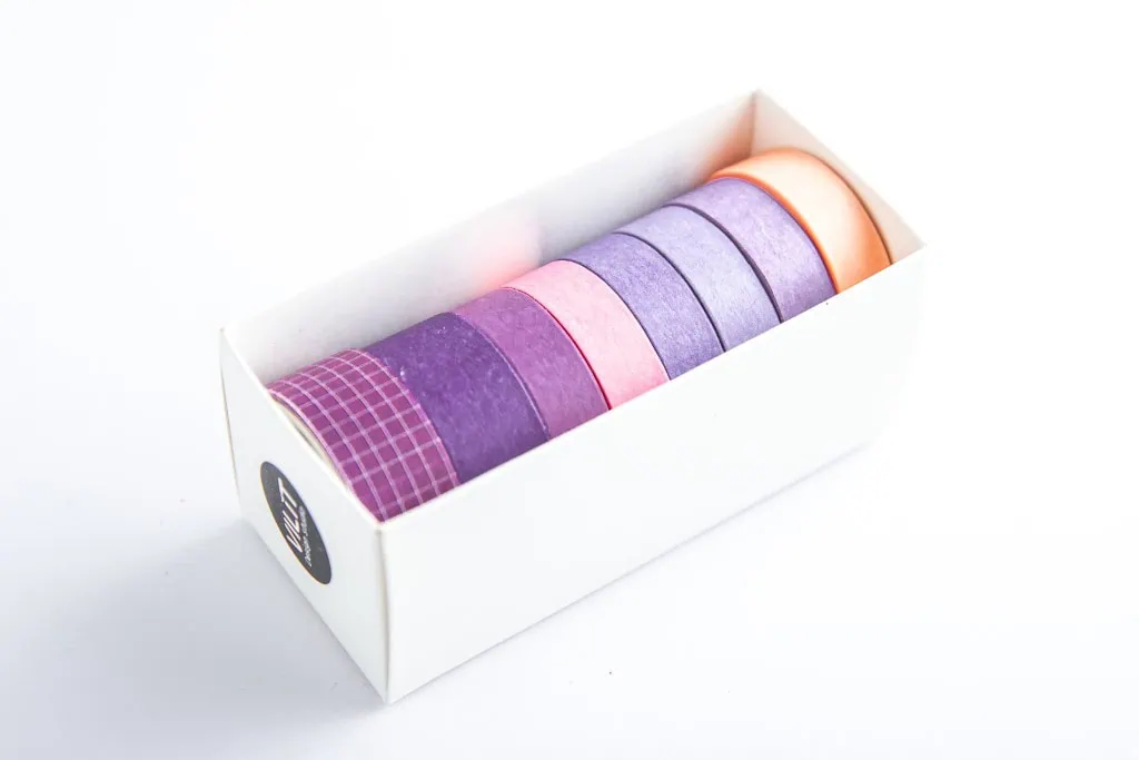 Zestaw taśm dekoracyjnych washi tape w fioletowych kolorach piękne dopełni Twoje notatki w planerze czy ozdobi Twój bullet journal. Delikatne fiolety przełamane różowym, purpurą czy odcieniami wpadającymi w niebieskie tony świetnie sprawdzą się w codziennym planowaniu.