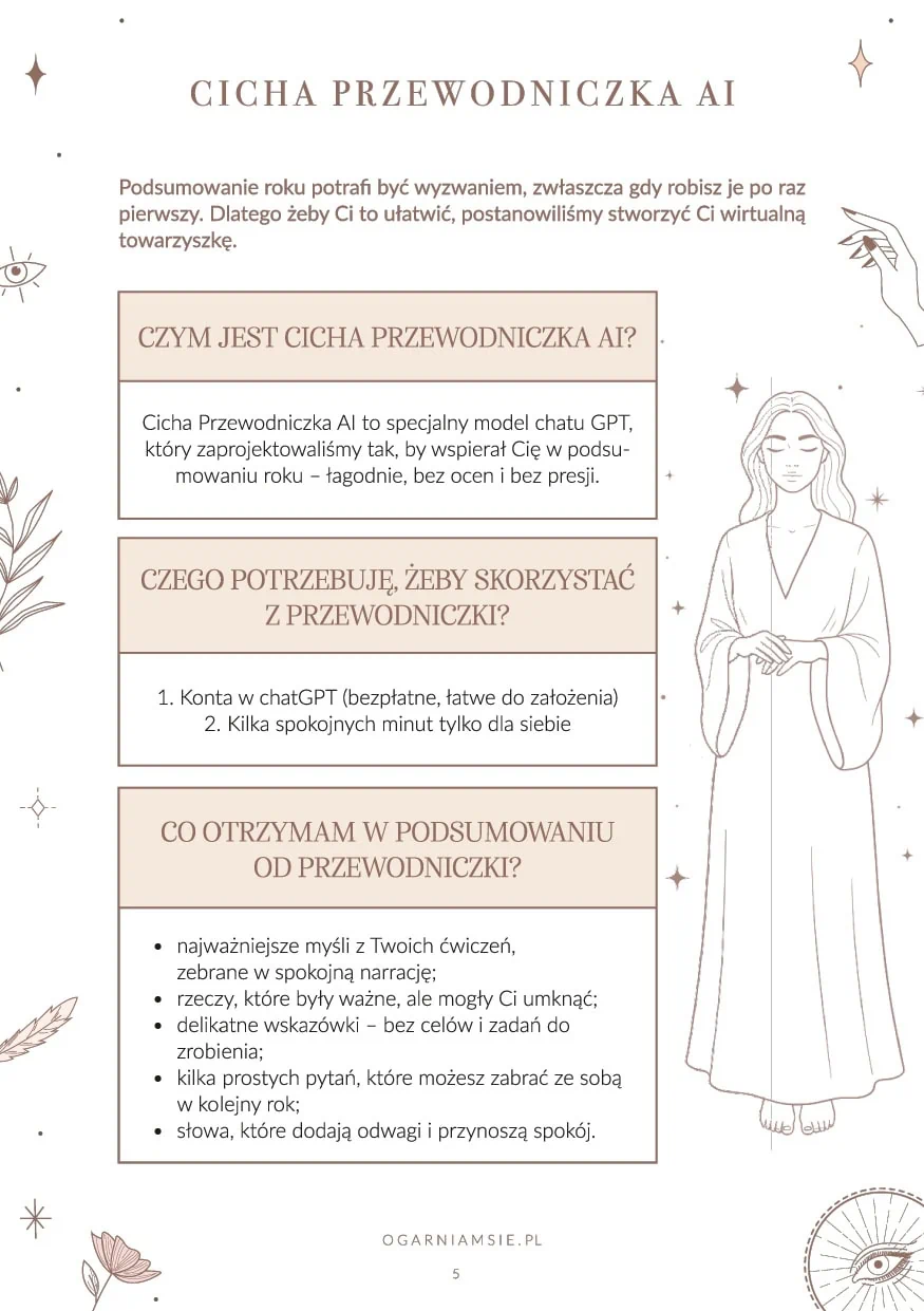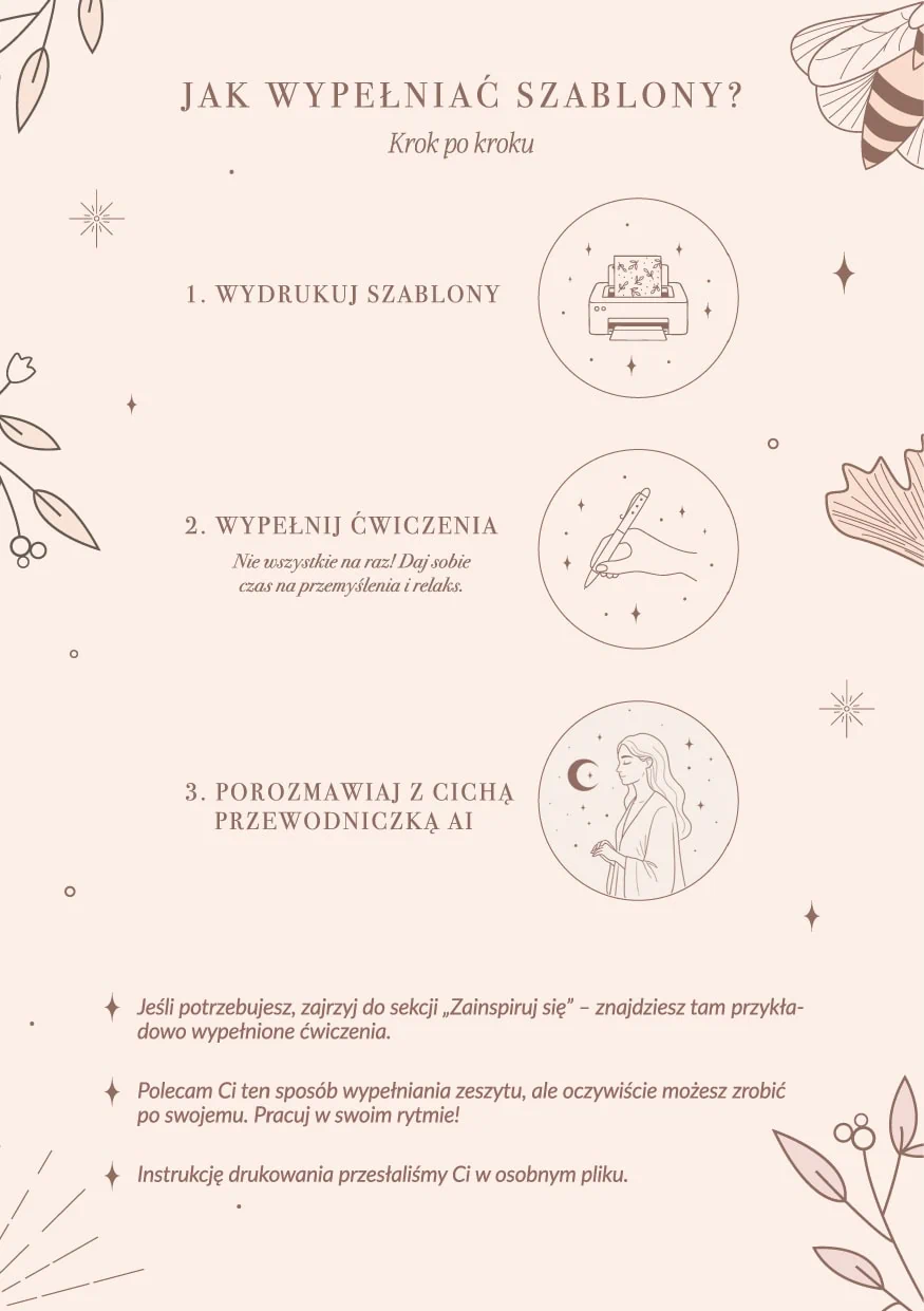 Cicha Przewodniczka AI jest Twoim wsparciem podczas pracy z workbookiem. Zadając pytania, pomaga uporządkować myśli i dostarcza nowych perspektyw, gdy czujesz się zagubiona. Dzięki niej odkryjesz, co naprawdę ma dla Ciebie znaczenie, bez presji i ocen.