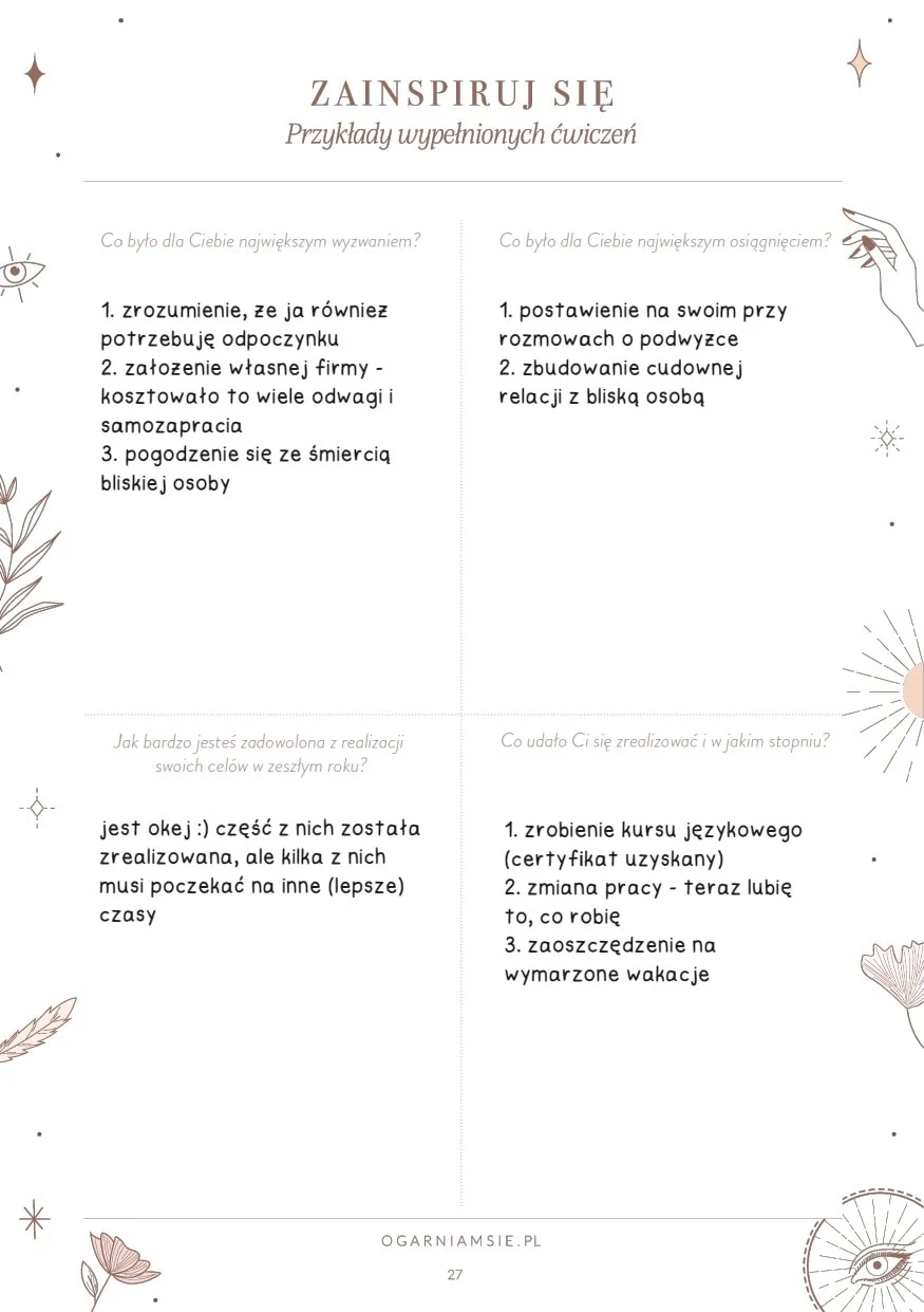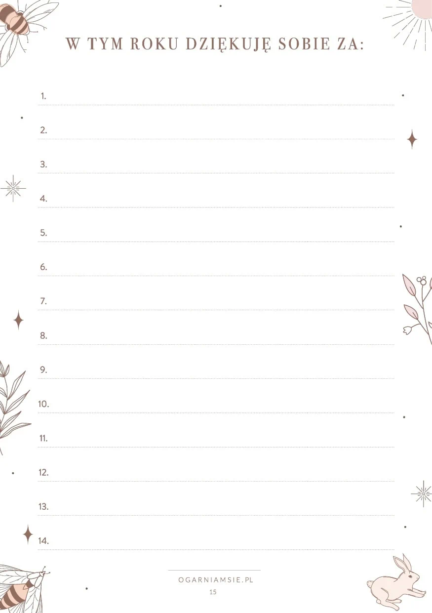 Ten zeszyt to Twoja przestrzeń do spokoju i wdzięczności. Zamiast zaczynać nowy rok od presji, zatrzymaj się na chwilę, doceń wszystko, co już osiągnęłaś, i zamknij ten rok z lekkością.