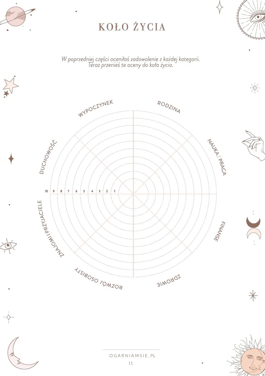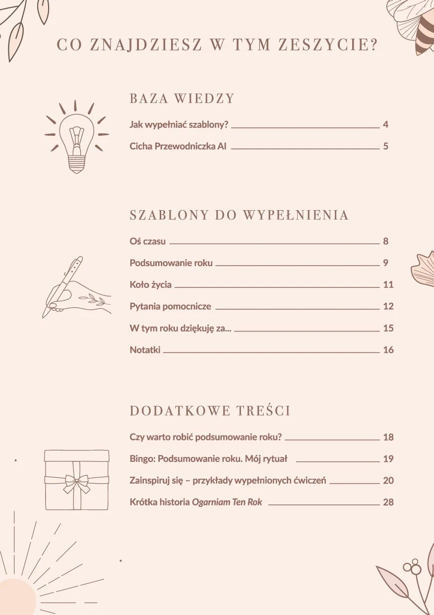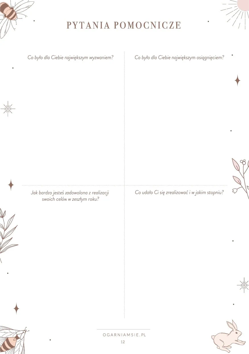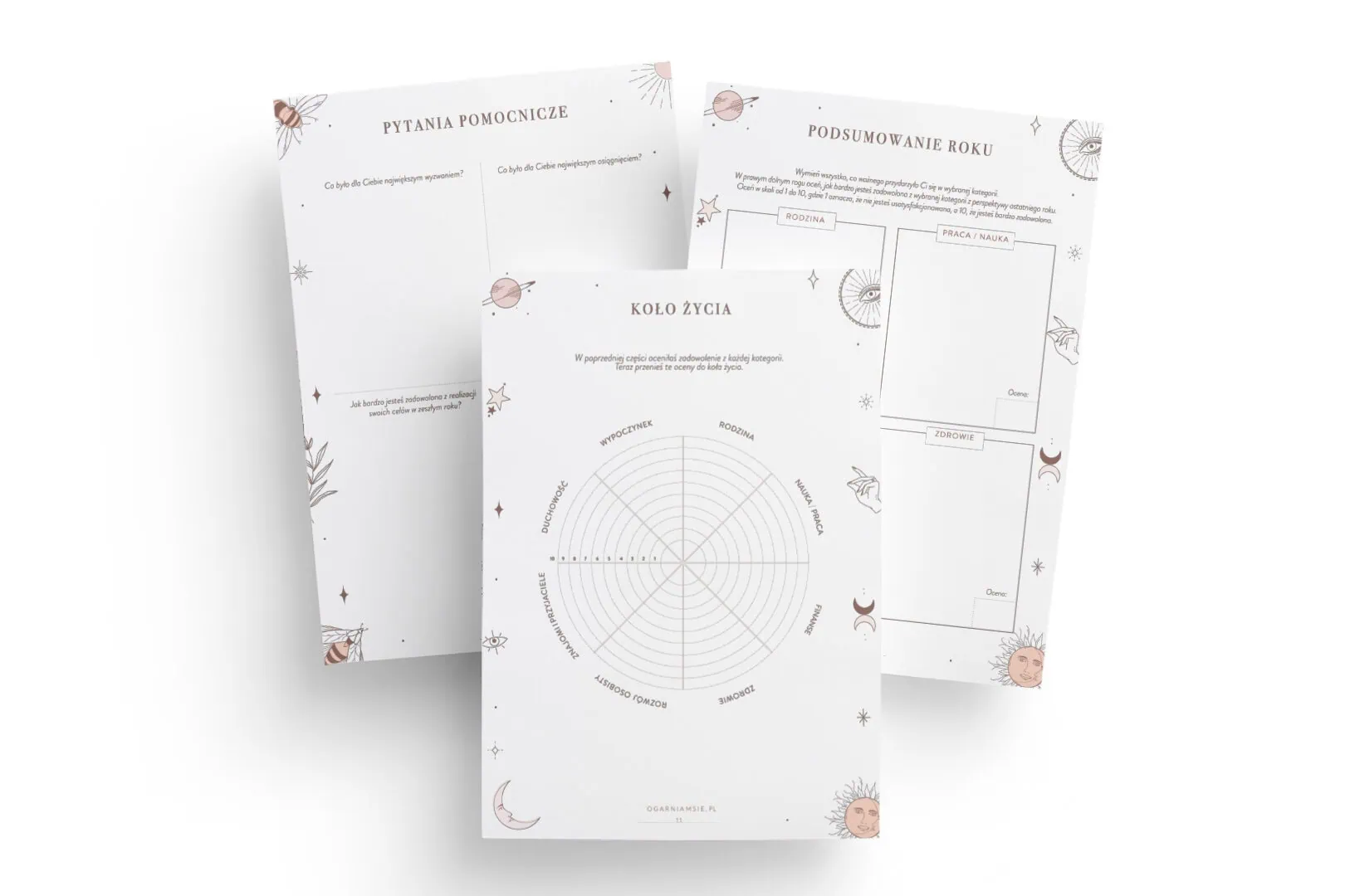 • Szablony do wypełnienia – czekają na Ciebie szablony do wypełnienia takie jak Oś czasu, Koło życia, Podsumowanie roku i Pytania pomocnicze, które pozwolą Ci przeanalizować miniony rok w różnych obszarach życia – od rodziny po pracę i rozwój osobisty.