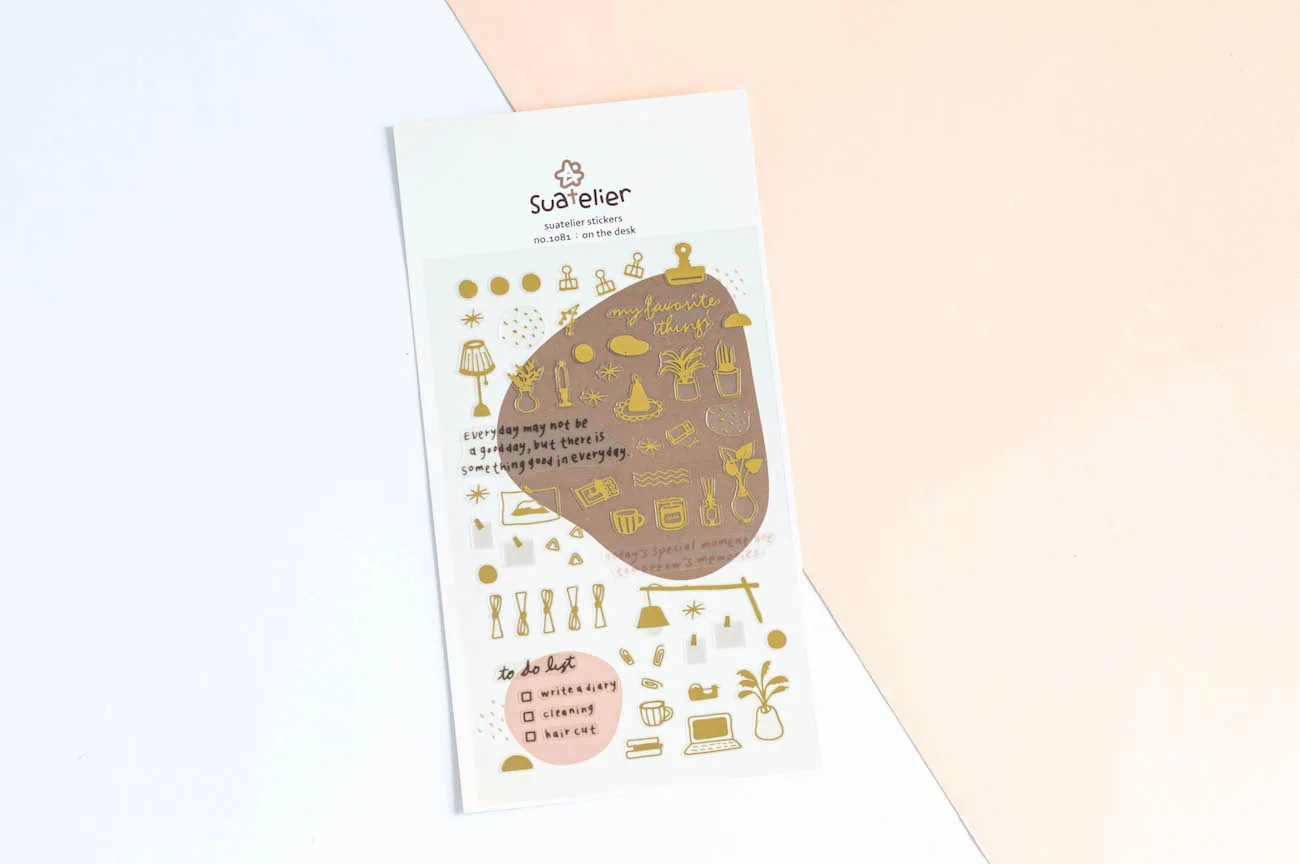 Złote ozdobne naklejki do planera lub bullet journal „Na biurku”